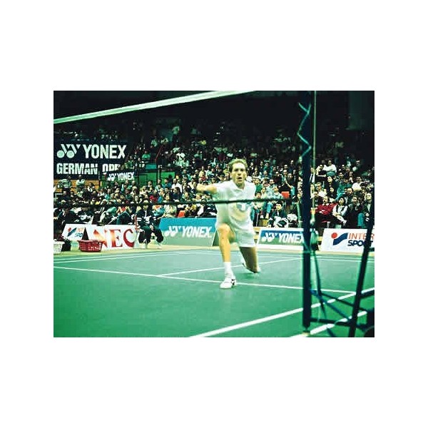 Badmintonová turnajová síť z vysokopevnostního polypropylenu, tloušťka 1,2 mm, světlost ok 18 mm, s 6,60 m dlouhým ocelovým lanem resp. kevlarovým lanem bez polyesterových prutů.