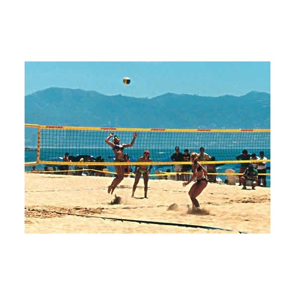 Turnajová síť pro plážový volejbal z polyesteru, tloušťka cca 3 mm, nahoře s kevlarovým lanem 11,70 m, dole se 4 mm tlustým napínacím lanem, výztuž okrajů z polyesteru se skelnými vlákny a 4 boční napínací šňůry. Kolem dokola s lemovkou v neonově žluté a nahořes reklaním potiskem Huck.