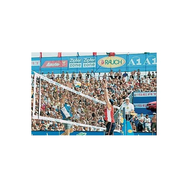 Síť pro plážový volejbal z cca 2 mm tlusté černé polyetylenové šňůry. Kolem dokola se 75 mm širokým lemem v různých neonových barvách.
