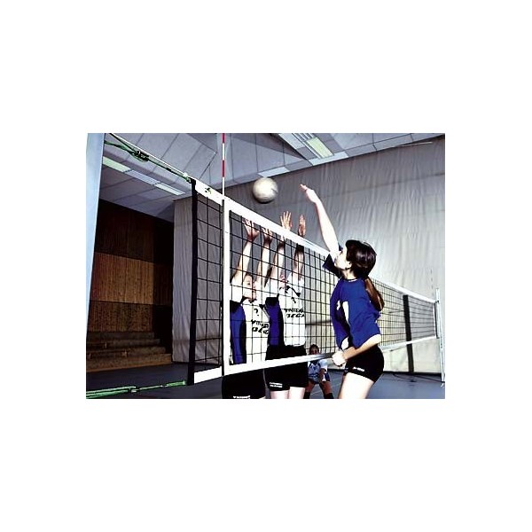 Vysokopevnostní bezuzlová volejbalová turnajová síť z polypropylenu, tloušťka cca 3 mm, s ocelovým lanem (tloušťka cca 5 mm), 4 napínací šňůry s rychlouzávěrem.