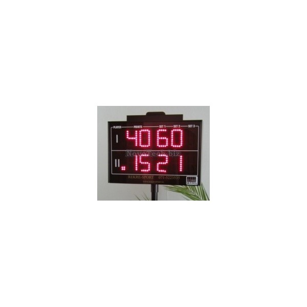 Elektronický ukzatatel skóre SCORE TRACK. Svítíci číslovyk z červených LED diod, zobrazují body ve hře, aktuální stav až ve třech sadách. Součástí je tabule na jména hráčů, a síťový napaječ. Při nabitých bateriích vydrží až 3 hod provozu. Možno zavěsit nebo postavit na stojan (nutno objednat samostatně).Součástí je tabule na jména hráčů, a síťový napaječ. Při nabitých bateriích vydrží až 3 hod provozu.